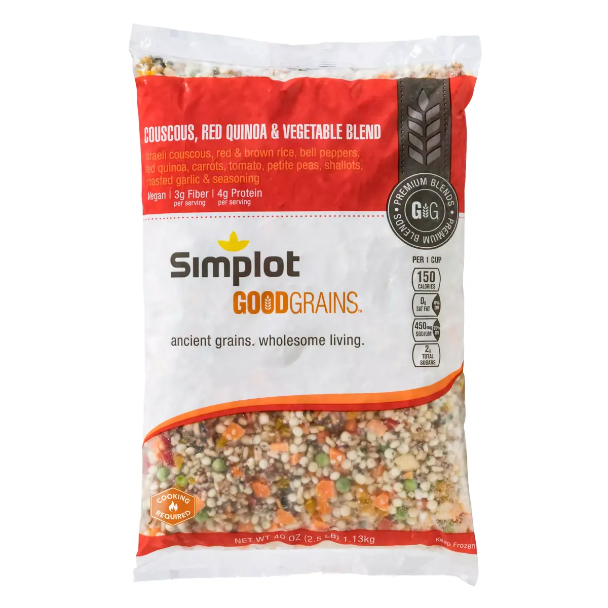 Simplot Good Grains™ Premium Blends feature nutritious whole grains and colorful vegetables in delicious combinations designed to appeal to the palates of today’s health-conscious consumers. This blend features all-natural quinoa, rice and couscous combined with colorful vegetables, lightly seasoned.