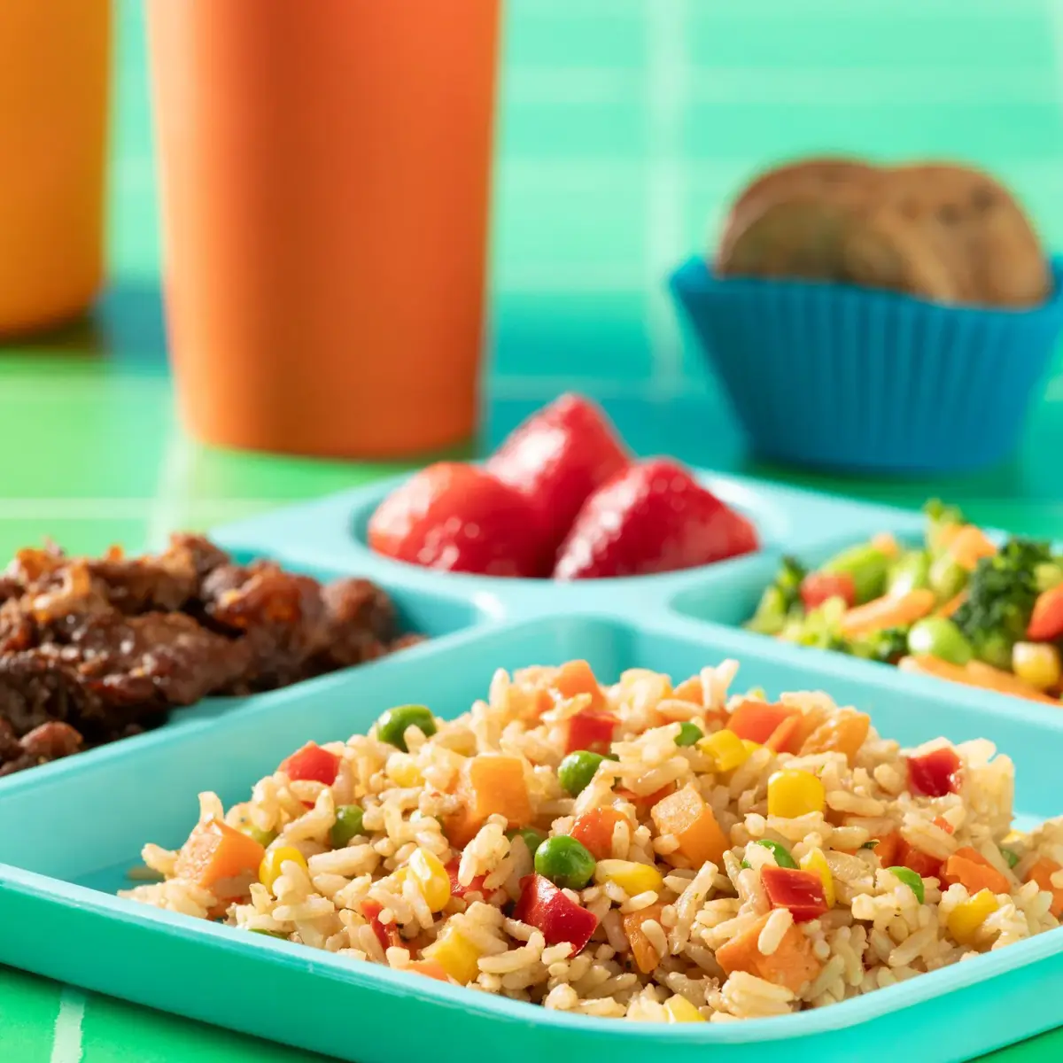 - Savory whole-grain rice with peas, carrots, corn and red peppers.