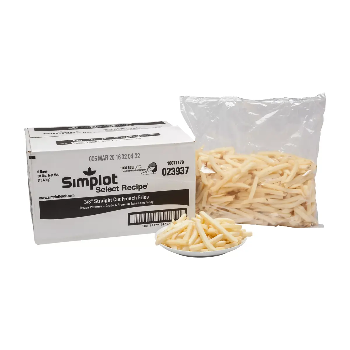 Las papas a la francesa Simplot Select Recipe® tienen un condimento consistente y un tiempo de conservación mejorado, gracias a su receta de alta cocina con sal marina real para realzar el sabor. Su aspecto de corte casero y gran largo le dan a estas papas a la francesa una gran presentación y rentabilidad. Este popular corte de 3/8 in se destaca por su sabor y versatilidad.