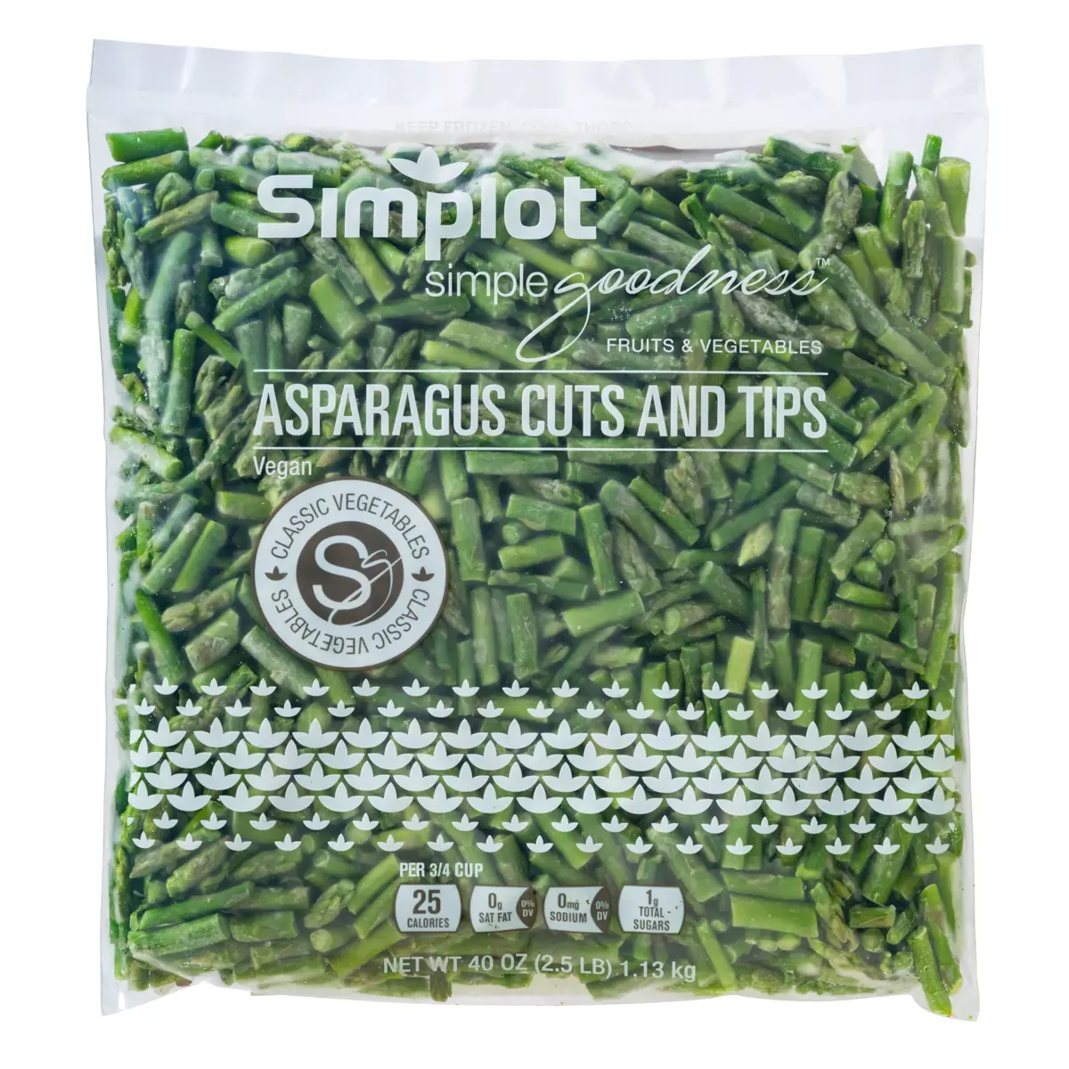 Simplot Simple Goodness™ Classic Vegetables offer the classic flavors and consistent blends that customers love. We do all the washing, slicing and trimming, so you get only 100% useable product and 0% waste. These asparagus cuts and tips are bright green and tender, with no fibrous stalks.